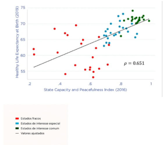Do mesmo modo, a capacidade estatal, em termos mais amplos (que envolve a capacidade burocrática juntamente com outros componentes, como capacidade fiscal, capacidade técnica, infraestrutura pública, entre outros) é condição necessária (ainda que não suficiente, claro) para proporcionar níveis satisfatórios de bem-estar, como ilustra o gráfico 2, que demonstra que, de forma geral, quanto maior a capacidade estatal de um país, maior a expectativa de vida saudável de seus cidadãos.