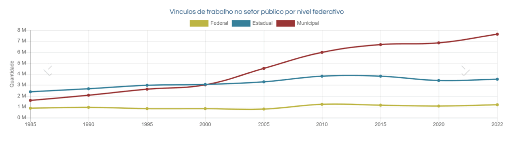 O elevado número de vínculos de trabalho no setor público no Nível Municipal se justifica porque os municípios assumem competências e responsabilidades diversas na Administração Pública brasileira. O período democrático promoveu a descentralização das políticas públicas, transferindo uma parcela da oferta de serviços para o Nível Municipal. Os municípios são grandes responsáveis pela oferta de Saúde, Assistência Social e Educação, setores que demandam muito recursos financeiros e humanos, o que explica a concentração de servidores neste ente federativo (Diniz, 2021).
