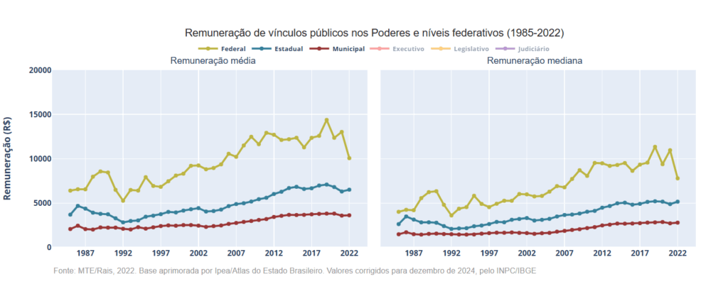 De outro lado, do ponto de vista das desigualdades entre os entes, o nível Municipal possui a menor média remuneratória do conjunto do serviço público, enquanto o nível Federal tem a maior remuneração média, como mostrado no gráfico abaixo. Enquanto a remuneração média máxima dos municípios entre 1985 e 2022 chega a R$3.814,69; a  remuneração média máxima no Federativo chega a R$14.377,80 – uma diferença de quase 4 vezes. Simultaneamente, a remuneração média máxima dos estados nesse período alcançou  R$7087,63, menos da metade do valor médio máximo do nível Federal (Ipea, 2025).