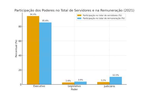 Também há forte desigualdade entre os três poderes do Estado – Executivo, Legislativo e Judiciário. Existe uma  maior concentração de servidores no Executivo, visto que 94.4% dos vínculos profissionais estão nesse Poder. Em contrapartida, apenas 3.2% dos vínculos estão no Judiciário e um número ainda menor, 2.6% dos servidores, atuam no Legislativo. A alta concentração de servidores no Poder Executivo é natural e esperada, já que a função principal desse Poder é colocar em prática as políticas públicas, o que faz com que seja necessário um maior número de servidores públicos atuando na elaboração e implementação das políticas, tornando-as algo concreto. Os outros poderes têm funções mais específicas e menos numerosas em termos de atuação diária (Kobunda e Lima, 2024). Em 2021, o Executivo representava 85.62% de participação de cada Poder no total das despesas com salários; o Legislativo, 3.88%; e o Judiciário, 10.49%.  Ou seja, enquanto tem 3,2% do total de servidores, o judiciário concentra o triplo 10,49% dos gastos com servidores, mostrando o desequilíbrio entre a situação dos servidores nos três poderes(Kobunda e Lima, 2024).