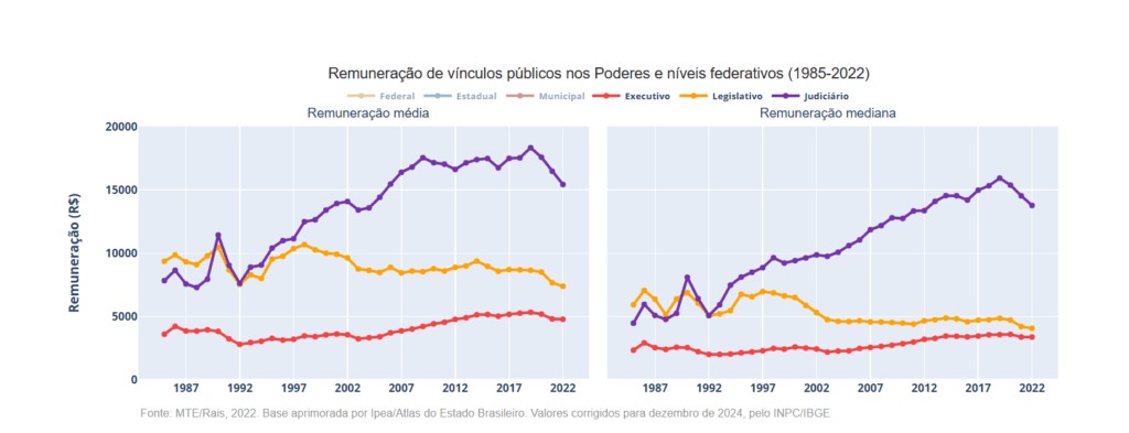 Como consequência da situação descrita, dados do Ipea mostram que a remuneração média do poder Judiciário é muito mais alta do que as dos demais poderes. Na série histórica de 1985 a 2022, a maior remuneração média do Executivo chegou a R$5810,38. O Legislativo alcançou o máximo de R$8824,04. Já o Judiciário, teve uma remuneração média máxima de R$18911,86, um valor três e duas vezes maior do que as médias máximas do Executivo e do Legislativo, respectivamente. Novamente, os dados demonstram uma desigualdade fundamental do serviço público brasileiro, dessa vez manifestada pelas grandes diferenças salariais entre os três poderes.