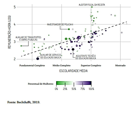 As discrepâncias salariais registradas no âmbito de cada Poder, ente federativo e carreiras estão relacionadas com fatores diversos. No artigo “Determinantes da desigualdade salarial entre as carreiras do governo de Minas Gerais” os autores Rodolfo Bechtlufft  e Bruno Costa tratam do serviço público estadual de Minas Gerais e defendem que embora  a escolaridade e a experiência formal sejam fatores importantes para explicar diferenças salariais no mercado de trabalho, elas não são suficientes para justificar a desigualdade salarial no setor público. É evidente que profissionais com formação extensa tendem a ocupar cargos com remuneração mais alta, porém, isso não conta toda a história.