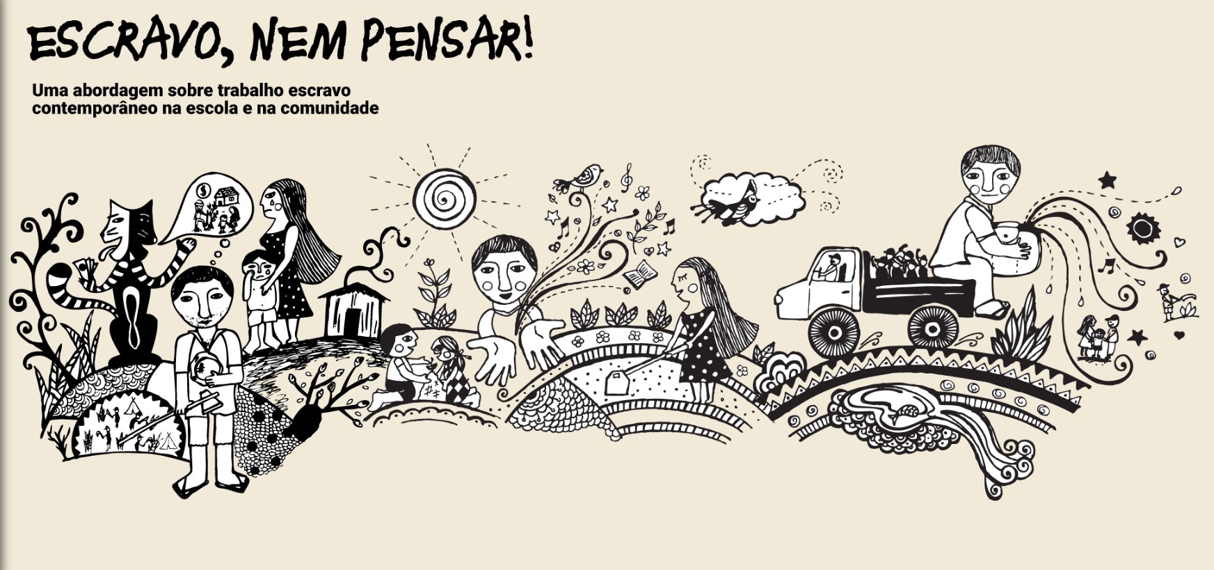 “Escravo, nem pensar”, publicação da ONG Repórter Brasil voltada a educadores/as e lideranças comunitárias, aborda o trabalho escravo e o tráfico de pessoas como graves violações de direitos humanos, propondo reflexões e atividades pedagógicas para fortalecer o protagonismo das comunidades no enfrentamento dessas práticas.